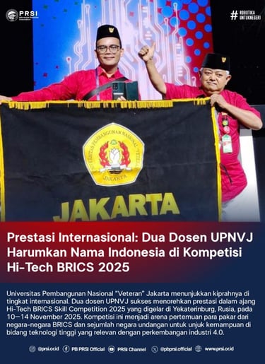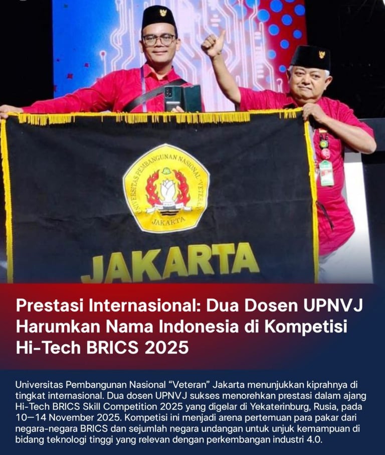 Universitas Pembangunan Nasional “Veteran” Jakarta menunjukkan kiprahnya di tingkat internasional. Dua dosen UPNVJ sukses menorehkan prestasi dalam ajang Hi-Tech BRICS Skill Competition 2025 yang digelar di Yekaterinburg, Rusia, pada 10–14 November 2025. Kompetisi ini menjadi arena pertemuan para pakar dari negara-negara BRICS dan sejumlah negara undangan untuk unjuk kemampuan di bidang teknologi tinggi yang relevan dengan perkembangan industri 4.0.